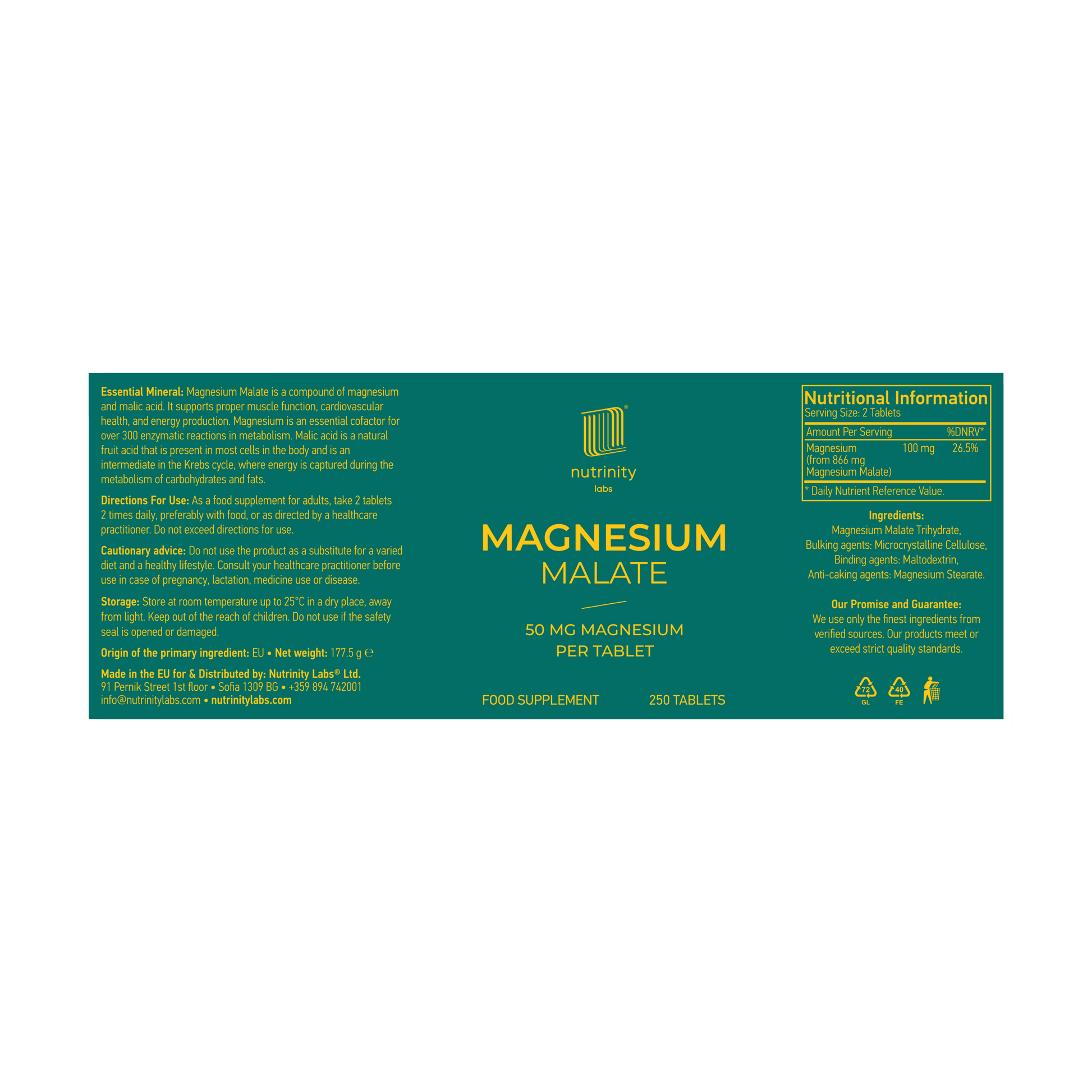 Ingredients: Magnesium Malate Trihydrate, Bulking agents: Microcrystalline Cellulose, Binding agents: Maltodextrin, Anti-caking agents: Magnesium Stearate.